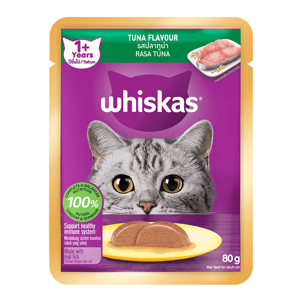 Whiskas Pouch Adult 1+ Tuna Flavor วิสกัส อาหารแมวแบบเปียก แมวโต 1+ ปี รสปลาทูน่า